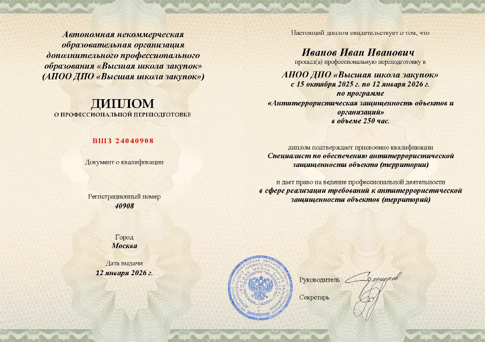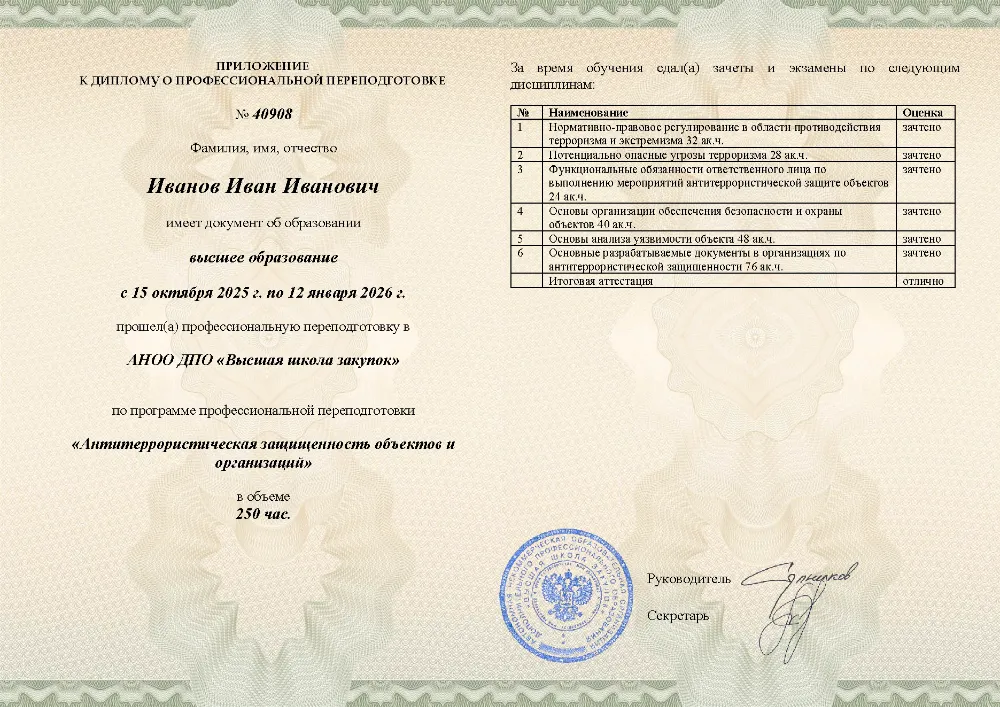 Повышение квалификации, 72 академических часов, 7 модулей: нормативно-правовые основы противодействия терроризму, анализ угроз и рисков, функциональные обязанности ответственных, инженерно-техническая укрепленность, документооборот и действия персонала при ЧС. Онлайн-обучение в в Туле с итоговой аттестацией.