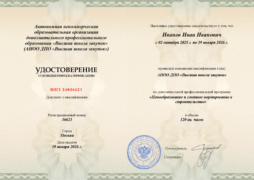 Повышение квалификации, 120 академических часов, 7 модулей: современное ценообразование и нормативная база, сметно-нормативные базы в строительстве, экономика сметной стоимости, определение стоимости ресурсов и конъюнктурный анализ, особенности расчёта стоимости монтажа и пусконаладочных работ, практическое составление смет в MS Excel, работа в программе «ГРАНД-Смета». Онлайн-обучение в в Туле с итоговой аттестацией.