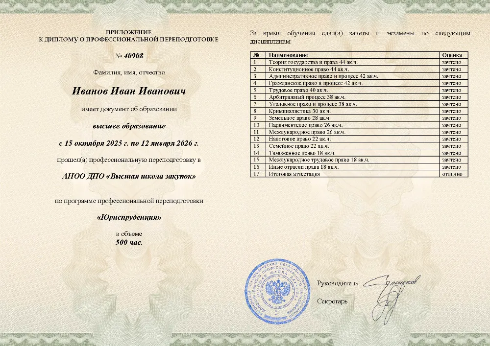 Профессиональная переподготовка, 500 академических часов, 16 модулей: теория государства и права, конституционное, гражданское, уголовное и трудовое право, арбитражный и административный процесс, налоговое, земельное, таможенное и международное право. Онлайн-обучение в в Туле с итоговой аттестацией.