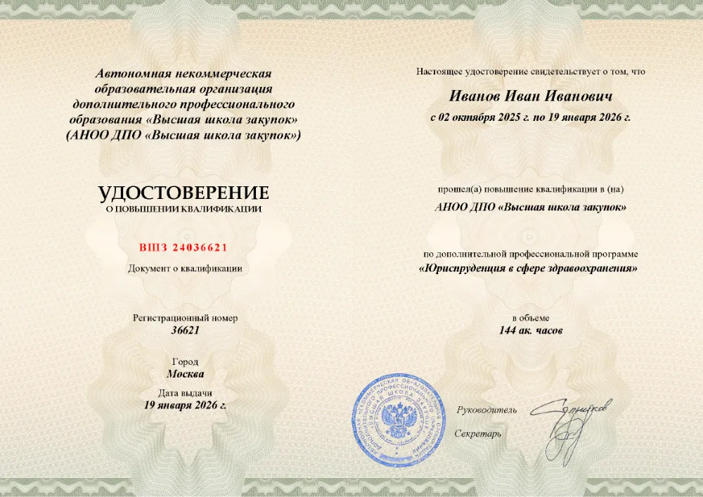 Повышение квалификации, 144 академических часа, 12 модулей: основы государственного, гражданского и административного права, трудовое и налоговое право, правовые основы охраны здоровья, права граждан и медицинских работников, юридическая ответственность в медицине. Онлайн-обучение в в Туле с итоговой аттестацией.