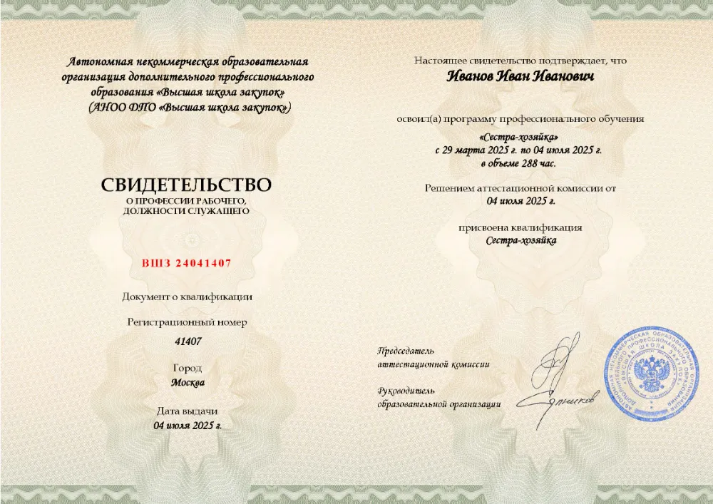Программа профессиональной подготовки (288 часов) для сестёр-хозяек. Освойте организацию санитарно-гигиенического режима, хозяйственную деятельность в ЛПУ, основы эпидемиологии, деонтологию, оказание первой помощи и профессиональные обязанности. Онлайн-обучение в в Туле с итоговой аттестацией.