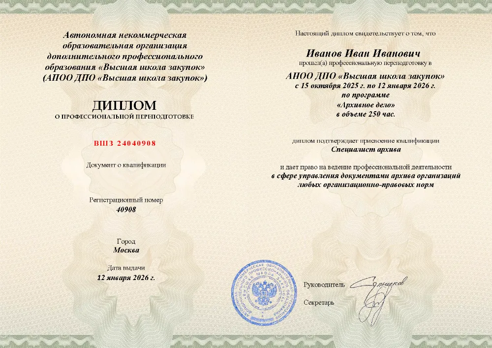 Программа профессиональной переподготовки (500 часов) для специалистов по документоведению и архивному делу. Полный курс от нормативно-правовых основ до современных технологий: экспертиза ценности документов, обеспечение их сохранности, создание поисковых систем и работа с документами по личному составу. Онлайн-обучение в в Туле с итоговой аттестацией.