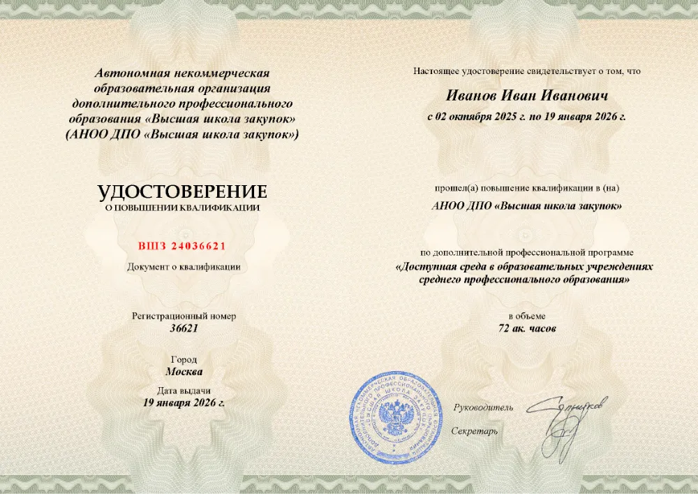 Повышение квалификации, 72 академических часа, 13 модулей: законодательные основы и направления организации доступной среды, паспортизация объектов, особенности работы с обучающимися с ОВЗ, педагогический контроль и методы управления временем педагога. Онлайн-обучение в в Туле с итоговой аттестацией.
