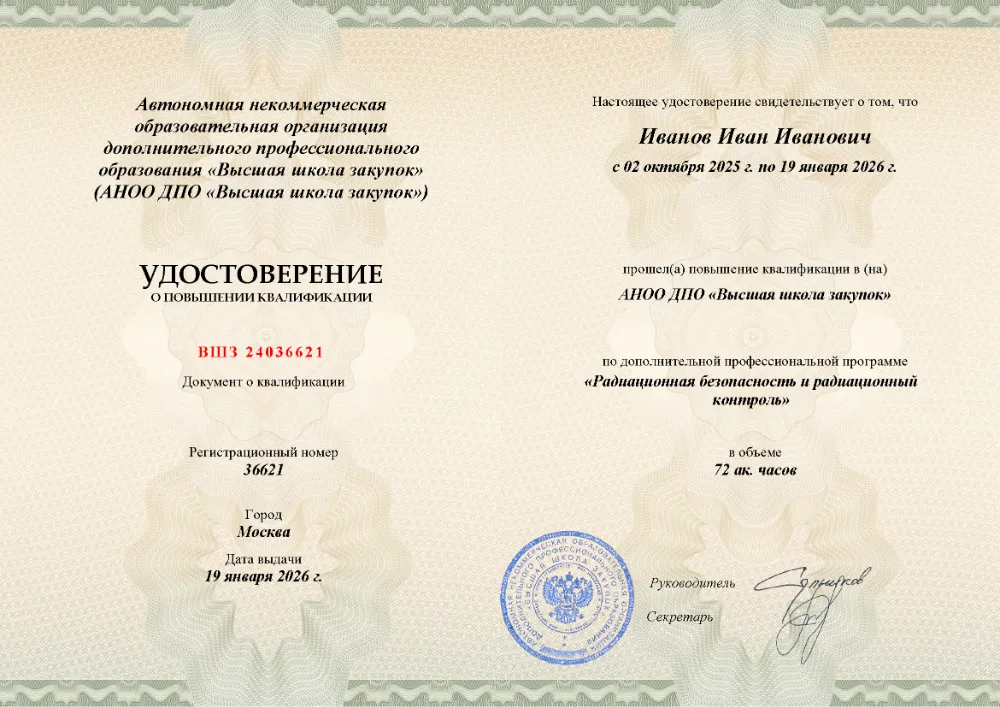 Повышение квалификации, 72 академических часа, 7 модулей: правовые и организационные основы деятельности, физические основы РБ и дозиметрия, учет РАВ и РАО, организация производственного контроля, обеспечение безопасности и физической защиты, документационное обеспечение и подготовка персонала. Онлайн-обучение в в Туле с итоговой аттестацией.