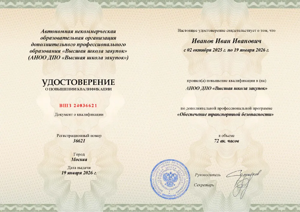 Повышение квалификации, 72 академических часа, 10 модулей: нормативная правовая база и система мер обеспечения транспортной безопасности, планирование и реализация защитных мероприятий, информационное обеспечение и государственный контроль, оценка состояния защищенности объектов. Онлайн-обучение в в Туле с итоговой аттестацией.